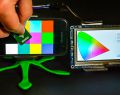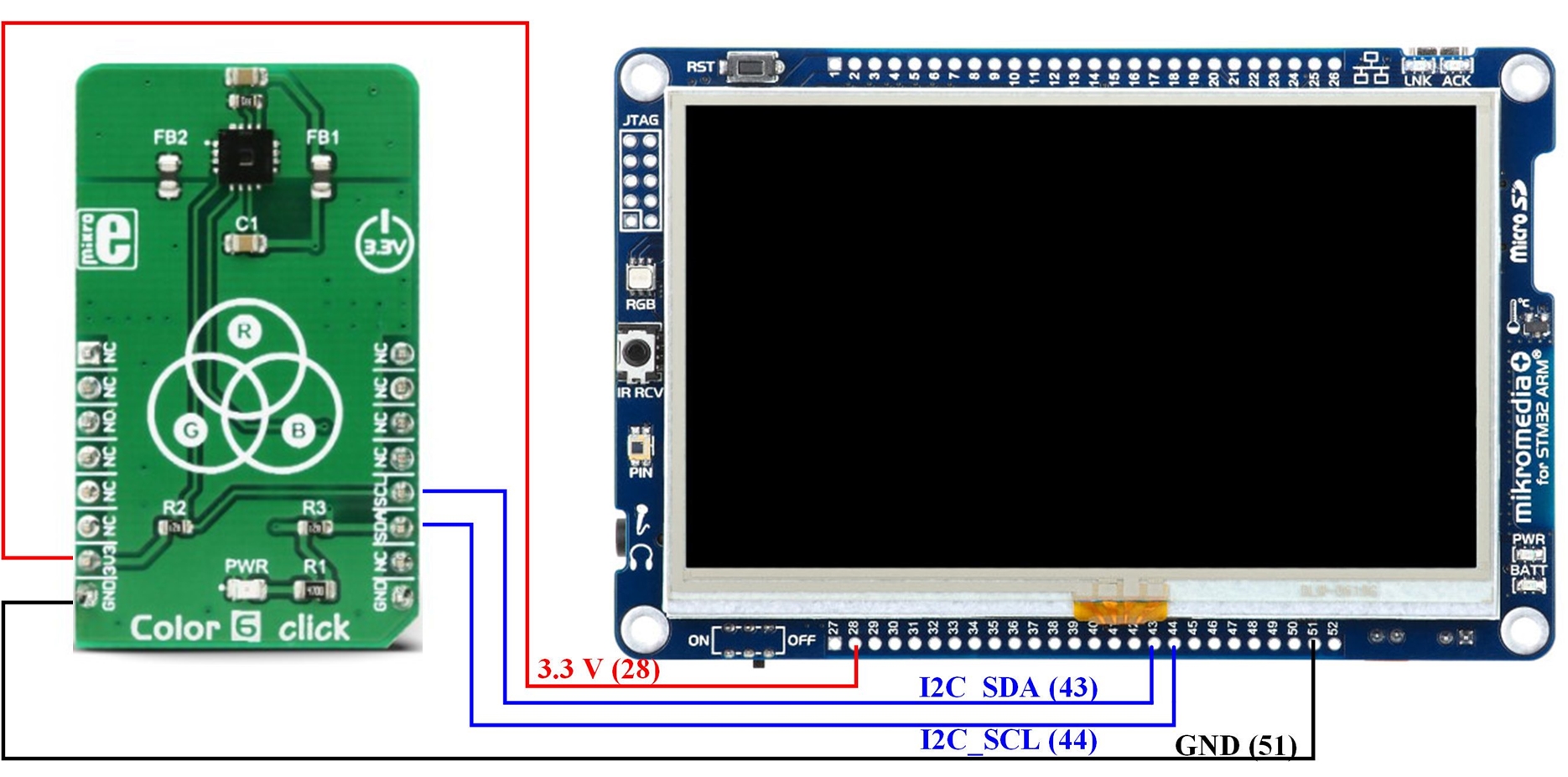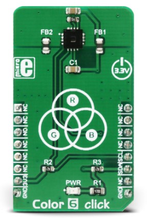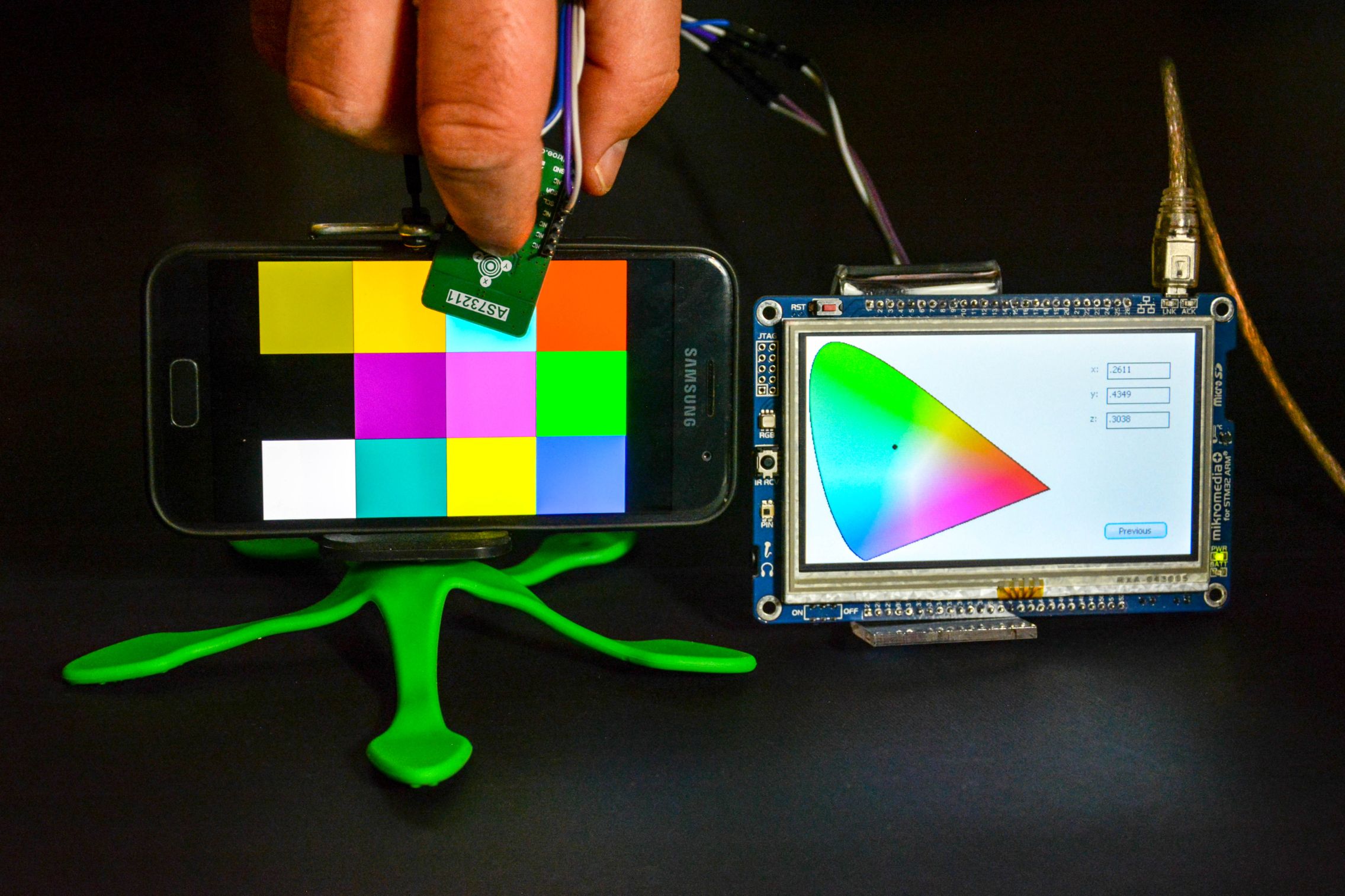 The idea of this project was implementation of the colorimeter using the AS73211 colorimetric sensor as an integrated circuit in the COLOR 6 click sensor board from Mikroelektronika. The sensor provides XYZ coordinates of the color as a scan result. Beside the sensor board, an embedded part of this system is the Mikromedia Plus for STM32F7 board with the STM32F746ZG microcontroller. On top of the Mikromedia Plus board a 4.3 inch TFT display with a resistive touch screen is placed. Color coordinates obtained by the sensor are sent to the microcontroller via the I2C communication protocol. The user interface of implemented colorimeter consists of two windows. The first window is used to display the values of the color coordinates and to configure the sensor by setting configuration parameters. Parameters must be set before color scanning. XYZ coordinates are converted to xy chromacity coordinates and displayed in the second window alongside the chromatic diagram where a visual representation of the scanned color can be seen. This system can be used as a standalone application or it can be integrated in a more complex application.